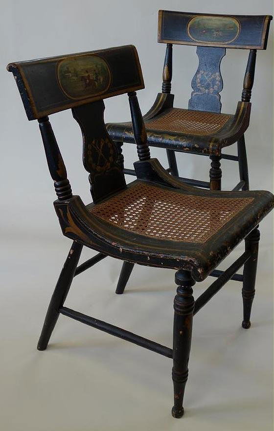 Pair of 19th century american fancy chairs with painted eagles to back rest and caned seats, one stamped on bottom ''foldham''.